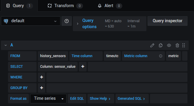 Now we can go ahead and create a new dashboard. In the new dashboard create a new panel. Scroll down and choose the values as shown in the screenshot: